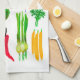 crisp white kitchen towel. This sweet design featuring a brightly painted selection of vibrant carrots, radishes, turnip,