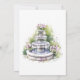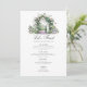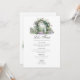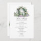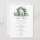 This elegant garden wedding menu design features a floral door arch and a fountain with customisable grey typography. Romantic, elegant wedding design.