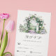 This RSVP wedding card design features a floral garden arch with a water fountain on a white background and customisable typography.