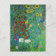 A fine art postcard with the painting by the Austrian artist Gustav Klimt (1862-1918) from (1906), Garden with Sunflowers (Bauerngarten mit Sonnenblumen). A garden landscape with red, blue and white wildflowers surrounding a large stalk of yellow sunflowers.