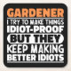 Funny Gardener Sayings "Gardener I Try To Make Things Idiot Proof But They Keep Making Better Idiots". Grab this Funny Gardener design as a funny gifts for an awesome mum, dad or friend.