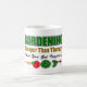 Gardening Cheaper Than Therapy And You Get Veggies funny mug. A great mug for a gardener who grows their own vegetables. It features cartoon vegetables. A great mug for anyone who loves backyard gardening! Do you garden to relieve stress?