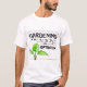 The design has a computerised drawing of a seedling in the corner, and writing in various fonts which reads 'Gardening is an exercise in optimism'.
