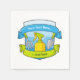 Gardening shield with clouds and sky background, tools, spray bottle and banners. Two custom text fields.