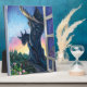 Gargoyle Guardian Art by Traci Van Wagoner prints, posters, accessories, and gifts features a blue and grey stone gargoyle looking back at you from his perch high above the city in the early morning with a textured sunrise sky of yellow, orange, pink, violet and blue. Get yourself a gargoyle guardian today to keep a watch out for you.
