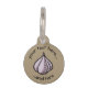 Rough sketch of garlic bulb. Custom background colour. Two text fields on circle. Custom text at back side.