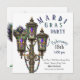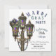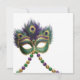 Mardi Gras party invitation featuring a antiqued gas lamp with hanging Mardi Gras beads and mask. Customise this party invitation with all your details. The reverse of this invite features a Mardi Gras mask and beads.