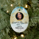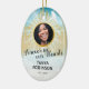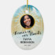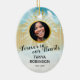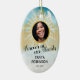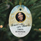 Personalised memorial keepsake christmas ornament for someone who has lost a family member, friend or pet. A perfect remembrance tribute tree decoration featuring a treasured photo, the golden gates of heaven in the sky, a white dove, their name, and living years.