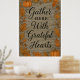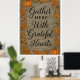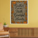 Bring the warmth of the season into your home with this rustic Thanksgiving wall art featuring the phrase “Gather Here With Grateful Hearts.” Set on a weathered wood-style background and framed with hand-drawn autumn leaves, pumpkins, and acorns, this design blends farmhouse charm with cosy fall colours.