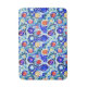 A colourful mosaic seamless pattern inspired in the artwork of Catalan architect Antoni Gaudi, featuring multicolored round blue, red and yellow tile pieces in different shades over a tiled light acqua blue background. A perfect gift for Catalan Modernism and Barcelona lovers.