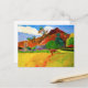 Paul Gauguin Mountains in Tahiti postcard. Oil painting on landscape from 1893. One of Gauguin’s most famous paintings, Mountains in Tahiti, or Tahitian Mountains, exhibits Gauguin’s vibrant use of colour and love for tropical landscape. This painting features a man carrying produce down a road towards red mountains and lush palm trees flaring with green and orange. A dog stands in the distance in a field with bright yellow grass near soft green bushes. A great gift for fans of Paul Gauguin, Cloisonnism, Tahiti, and tropical painting.