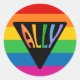 This gay pride supporter design features the rainbow text "ally" in a triangle.