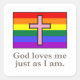 Tell everyone that you can be both gay and Christian. Shows the rainbow pride flag, superimposed with a pink cross, with the slogan, "God loves me just as I am."