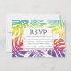 Gay and lesbian wedding rainbow tropical leaves RSVP card. It displays a pattern of monstera and palm leaves in rainbow colours and your text in a frame. The back covers a polka dot pattern.