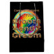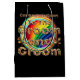 The design is chic, trendy, simple and elegant; a black wedding gift bag with faux gold roses and letters. A large circle of rainbow pride colours underlays the script and roses. The message on both sides reads: "Congratulations to the Groom and Groom." Choose another background colour, if you wish. For the wedding or engagement party. Use with matching gift tag.