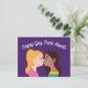 Happy Gay Pride Month Postcards featuring two pretty girls kissing. This romantic LGBT postcard features a cute blonde woman and a beautiful brunette female in a rainbow shirt. Customise this purple LGBTQ card with your own custom text.