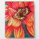 From a vibrant watercolour painting of a macro close up Gazania orange and yellow flower. Painted by watercolour artist Sacha Grossel, this native South African fine art desert flower is bright and stunning against a dark green background.