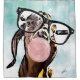 Cool blue Watercolor backdrop showcases this nerdy Nubian goat with oversized eyeglasses - this silly geek goat is in front of blue watercolor backdrop is blowing a bubble with Bubblegum -
