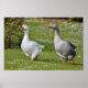 Two geese (Anser anser domesticus), one white,one grey, walking on the grass in front