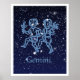 Poster featuring the symbol for Gemini in soft silver blue, overlaid with the stars of the constellation, against a starry sky background graded from deep midnight blue to black.