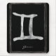 Stylised hammered silver Gemini the Twins astrology zodiac birthday symbol in a hand drawn silver fine double line frame. Gemini text in a silver script font can be customised to add a personal touch.