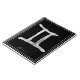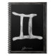 Stylised hammered silver Gemini the Twins astrology zodiac birthday symbol in a hand drawn silver fine double line frame. This notebook or dream journal or writing pad has Gemini text in a fine script, which can be personalised to narrate your own story.