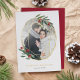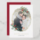Elegant geometric holiday cards feature your favourite photo set inside a gemstone inspired frame in shining gold foil, accented with green watercolor leaves and red berries. Personalise with your names and a short custom holiday greeting (shown with "happiest holidays").