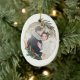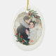Elegant photo Christmas ornament features a favourite photo encircled by a faux gold foil oval geometric frame with green watercolor foliage and red berries. Add your names and the year, or a custom message, to the reverse side in a matching delicate geometric frame.