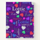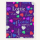 Cute originally designed text name personalised notebook. Diamond, emerald green, sapphire blue and pink, amethyst purple and red ruby with typographical text pattern on both sides. Customise with your own short name, currently reads Lottie. Other names available or contact me for longer name requests. Original watercolor gemstone art and design by Sarah Trett for www.mylittleeden.com