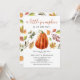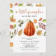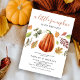 Rustic autumn baby shower invitations featuring a simple white background, cute watercolor fall leaves, a pumpkin, and a modern baby shower template that is easy to customise.