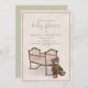 This design features a gender neutral cute vintage classic invitation, with a rustic classic teddy bear green, with store website for online with QR code for online store URL, gift registry, a trendy bear stuffed animal teddy, an elegant calligraphy script typography, a trendy classic traditional invitation, a vintage cradle bassinet crib bunting, a brown tan sage green beige, an old fashioned simple minimalist style, for a gender neutral baby shower invitation, for a boy or girl baby shower hand-drawn artwork by Laura Lacina.