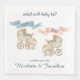 These custom baby gender reveal party napkins feature an old-fashioned watercolor style design. An image of a vintage style carriage is printed on either side of the invitation. A stuffed baby bunny is sitting in front of the carriage. The left side features a blue ribbon with the title "BOY" on it, and the right side features a pink ribbon with the "girl" title printed across it.