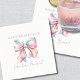A charming cocktail napkin design featuring a large pink and blue watercolor bow in the centre. At the top, "Baby Last Name" is displayed in a classic serif font, with "Gender Reveal" elegantly written below in handwritten script.