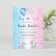 For a gender reveal baby shower. A blue white and pink gradient background. Decorated with glitter and blue, pink and white balloons and glitter dust. A baby boy elephant and a gaby girl elephant. Personalize and add the names of parents to-be and party details. The name and the text: Boy or Girl are written with a hand lettered style script