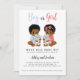Announce your exciting gender reveal with this charming invitation featuring two adorable African American babies, each holding a cuddly stuffed bear. The boy is dressed in blue and the girl in pink, creating a warm and inviting look. Fully editable text lets you customise every detail to make your event truly special and memorable. Ideal for any gender reveal celebration!