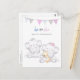 Adorable modern design featuring two baby elephants with a grey/pink and blue flag banner at top where "he or she what will our peanut be?" is titled. On reverse side are our invitation templates, greenery and wand with bubbles flowing. Girl elephant holding a brown dog.