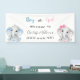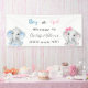 For a gender reveal party. A chic white background. Decorated with glitter and blue, pink and white balloons, a baby boy elephant and a baby girl elephant. Personalise and add the name's of the parents. The name and the text: Boy or Girl are written with a hand lettered style script