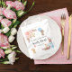 A white background. Decorated with rose gold, blush pink and blue florals, pampas grass. A teddy boy holding a blue balloon and a teddy girl holding a pink balloon. Personalise and add the parents names and the party date.