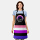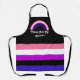 Medium-sized apron with an image of a genderfluidity pride flag and a rainbow; pink, white, magenta, black, and purple design on a black background, with a customisable text template for your own name or message