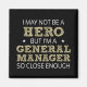 I may not be a hero, but I'm a General Manager so close enough humourous word art in sans-serif and doodle cross-hatch font lettering in white and golden yellow.