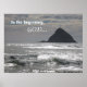 Stunning view of Oregon's rocky coast, with waves crashing in, and words from Genesis 1:1: "In the beginning...GOD."