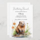 A soft watercolor illustration of a small marmot standing by the water’s edge, surrounded by wildflowers and fresh green grass. With warm brown fur and curious eyes, the scene captures a peaceful moment in nature, evoking calm, innocence, and the quiet beauty of the meadow.