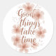 Embrace the gentle pace of life with this beautiful and encouraging message. The quote "Good things take time" is softly nestled among delicate, peach-coloured blossoms, creating a serene and hopeful visual. It's a perfect, elegant reminder to trust the process and allow yourself to bloom in your own time.