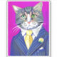 Sticker in a dignified gentleman cat, with green eyes, in a blue striped suit, with a yellow tie and lapel flower
