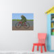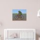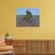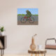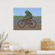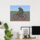 A dark green frog wearing a tan plaid ivy cap (or driving cap) and a satisfied smile pedals along on a red bicycle on a dirt road by a moss-covered grey stone wall in the mixed media image on this poster print. With deep blue skies above, it looks like he has a beautiful day for cycling! From my original digitally created image.