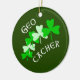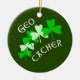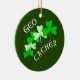 Geo Cacher text and a splash of shamrocks is a unique geocaching design for St Patrick's Day, birthdays and geocaching events.