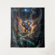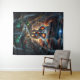 A surreal and fantastical scene featuring a vibrantly coloured elephant standing in the middle of a rocky, mountainous landscape. The elephant is adorned with intricate, swirling patterns in bright hues of blue, orange, and red, giving it an otherworldly appearance. The background highlights dramatic, cloud-filled skies with a cosmic element, as a starry night sky is visible above.