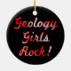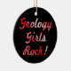This hanging ornament features the phrase "Geology Girls Rock!" Because they do! The font is red with a cloudy pattern applied.