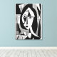 This is a striking and original abstract portrait of a woman’s face, created with geometric shapes and lines. The portrait is in black and white, giving it a minimalist and elegant look. The woman’s face is in the centre of the image, with her eyes closed and her lips slightly parted. Her expression is peaceful and serene, as if she is in a state of meditation or relaxation. The background is composed of various shapes and lines, creating a pattern that adds interest and contrast to the portrait. This artwork is a versatile and creative piece that can be used as a painting, a t-shirt design, a phone case, or any other product you can think of