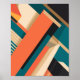 A bold geometric abstract artwork featuring layered shapes in vibrant orange, teal, beige, and black. The sharp angles and intersecting lines create a sense of movement, depth, and modern architectural style. The composition combines warm and cool tones, giving it a dynamic and contemporary aesthetic.